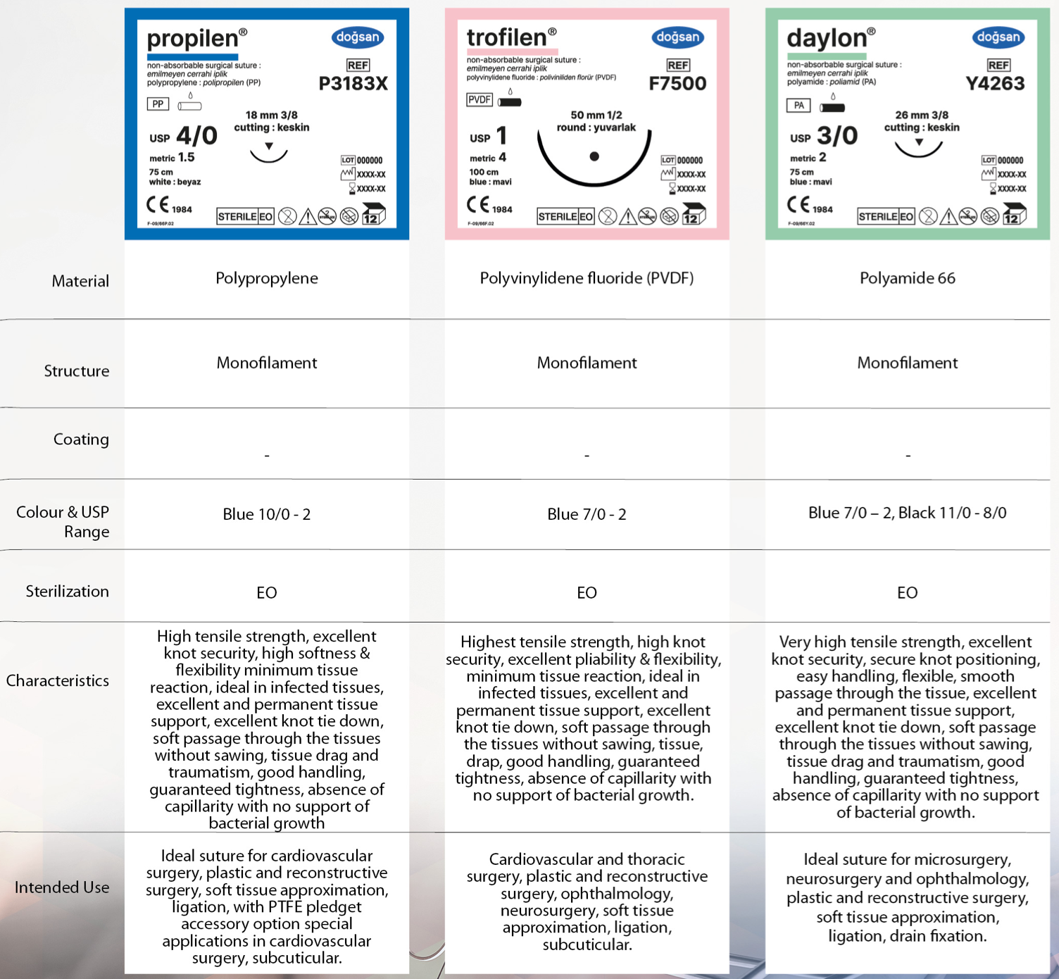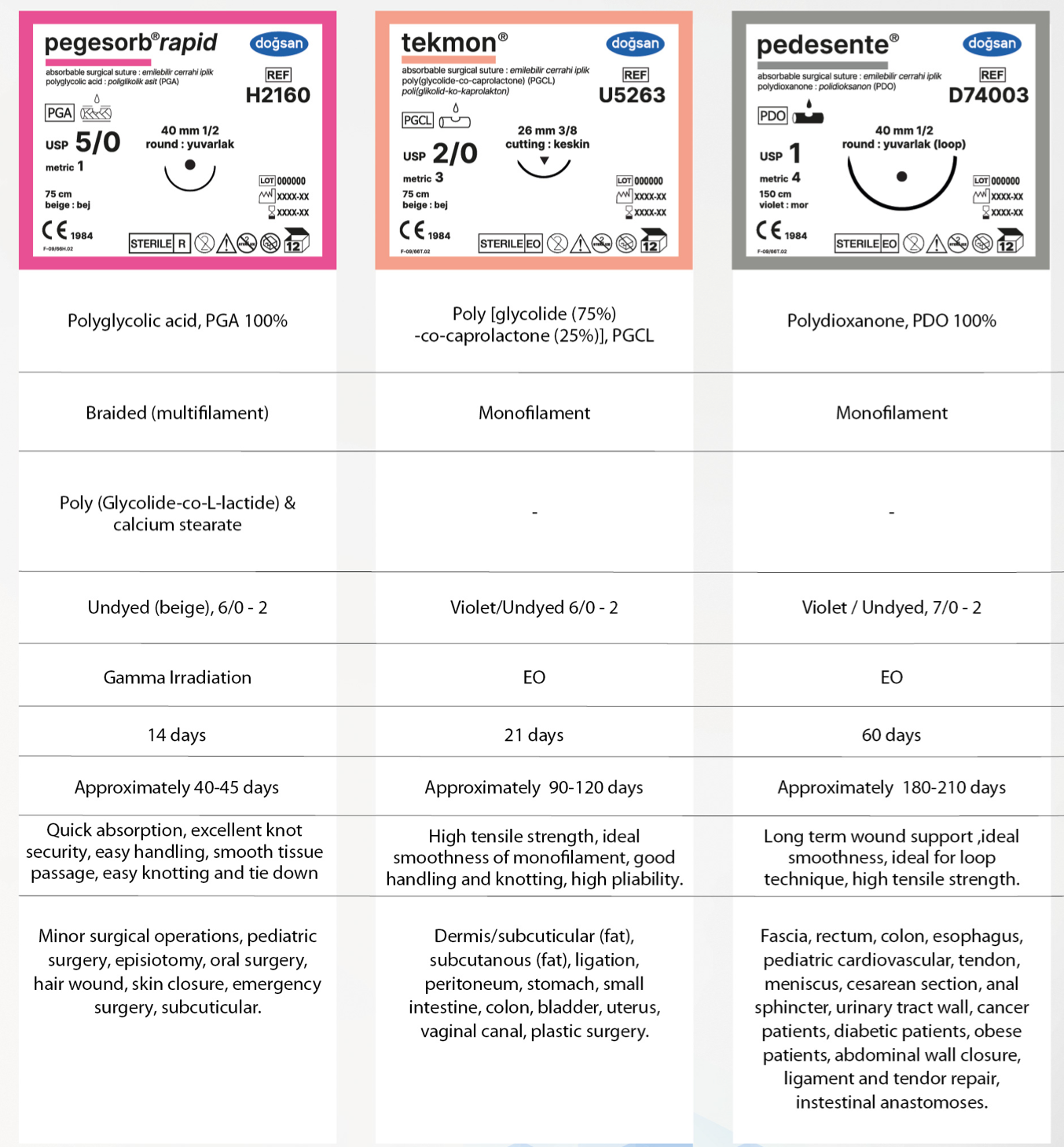 Mit dem breiten Produktspektrum der absorbierbaren und nicht-absorbierbaren chirurgischen Nahtmaterialien hat sich Dogsan weltweit einen hervorragenden Ruf hinsichtlich Qualität und Sicherheit bei all seinen Anwendern geschaffen.